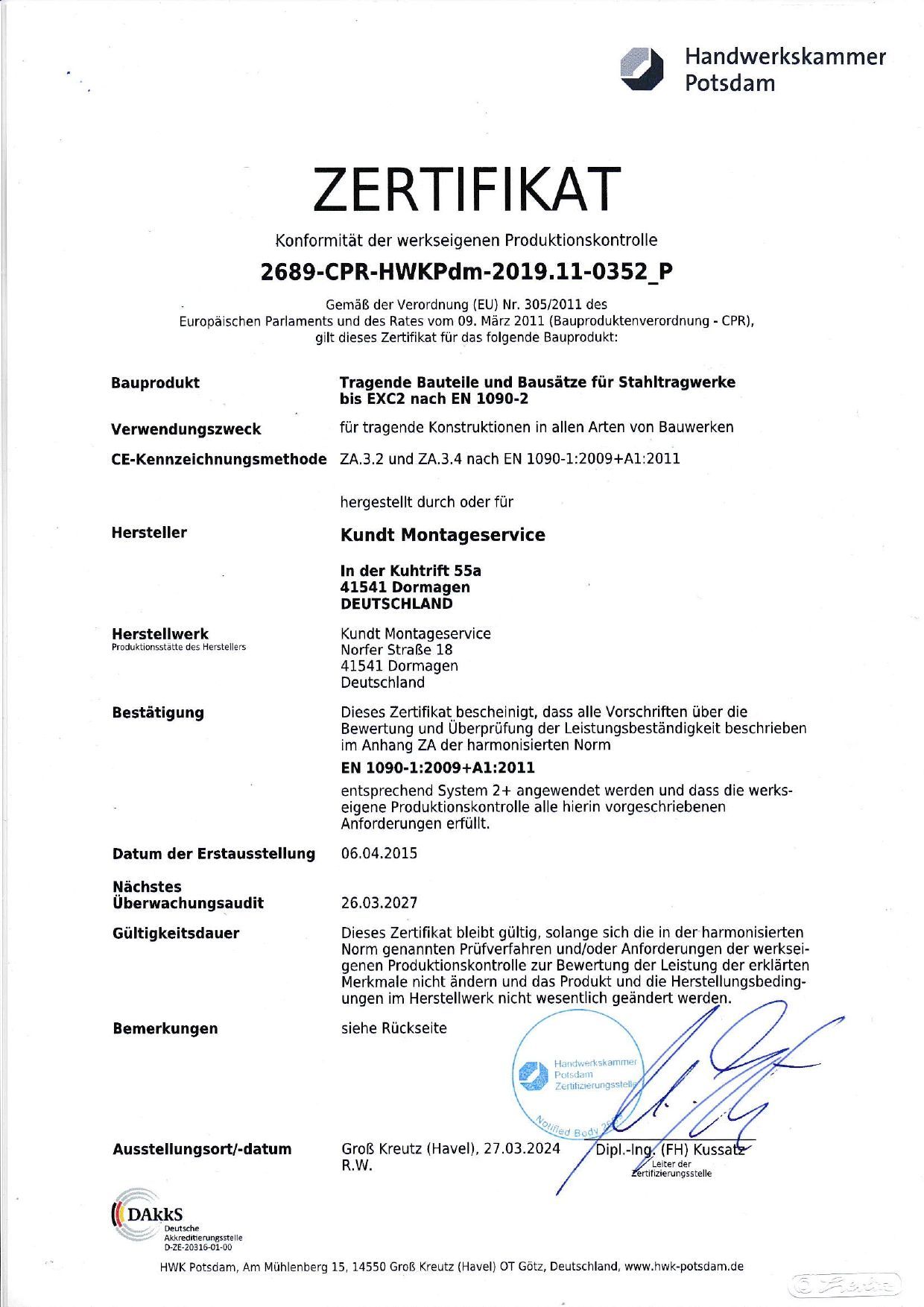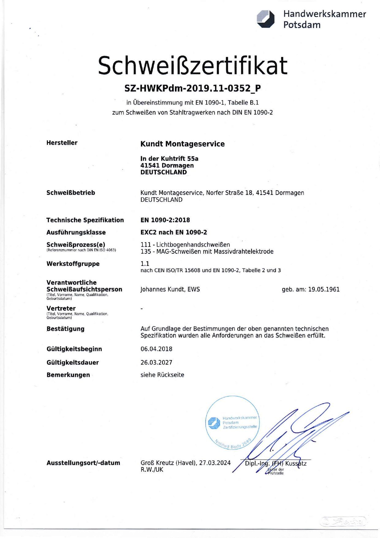 Die Zertifizierung nach EN 1090-2:2011:10 bis EXC2 sichert Ihnen qualifizierte Schweißarbeiten. Unsere erfahrenen Fachkräfte bauen alle tragenden Bauteile und Bausätze für Stahlkonstruktionen den geltenden Normen entsprechend auf oder ab. Zudem besitzt unser Team die gültigen Prüfbescheinigungen und wird laufend geschult.